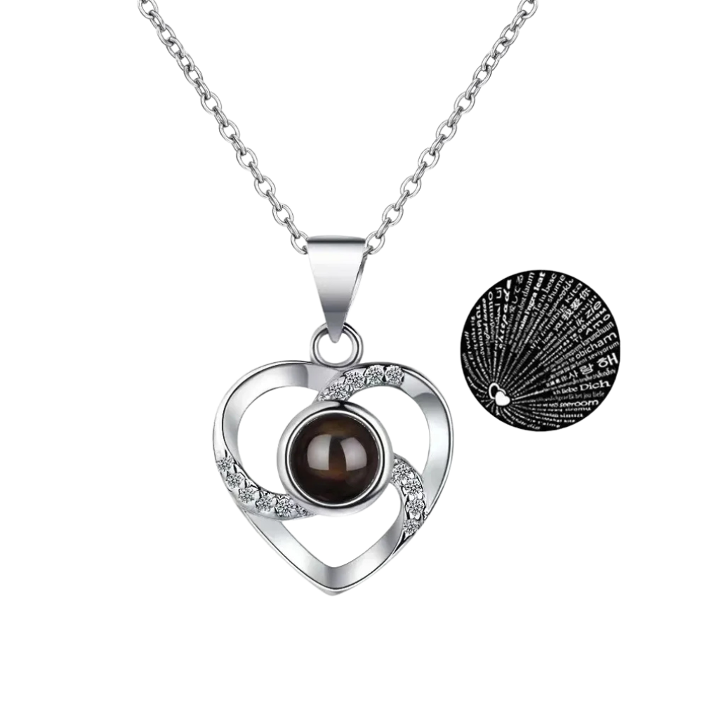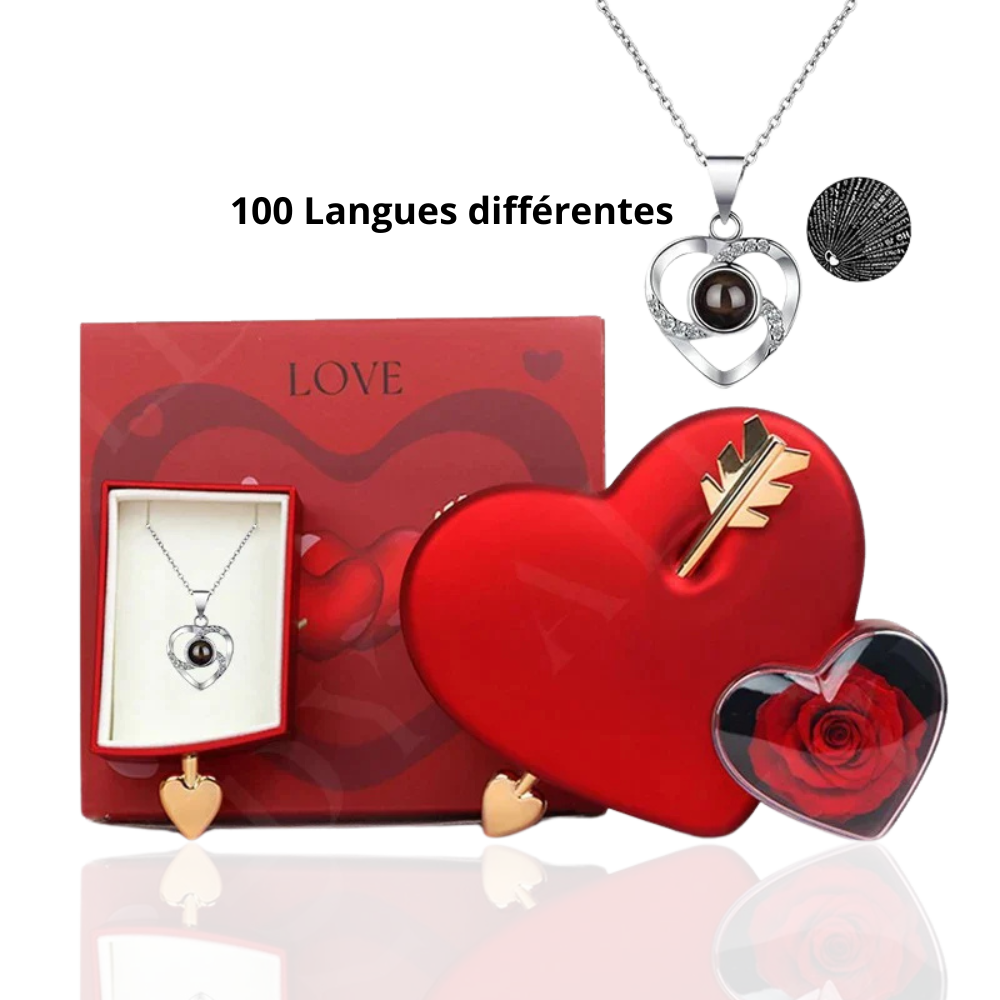 Ce coffret en forme de cœur, orné d’une rose éternelle, renferme un bijou en acier inoxydable dans son tiroir secret.