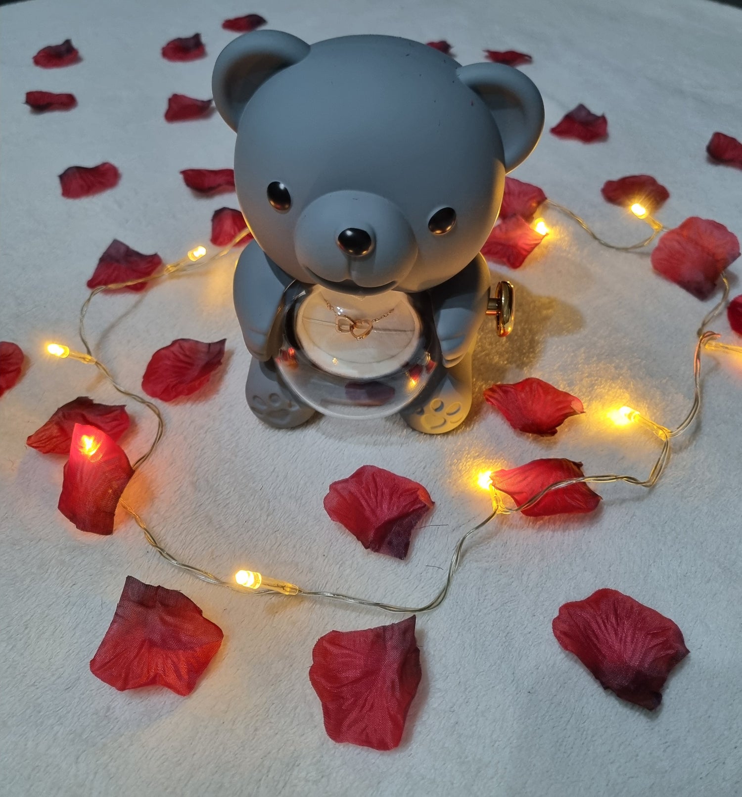 Sous sa douce apparence d’ourson, cette boîte cache une rose éternelle et un collier scintillant, une surprise pleine de tendresse et de raffinement.